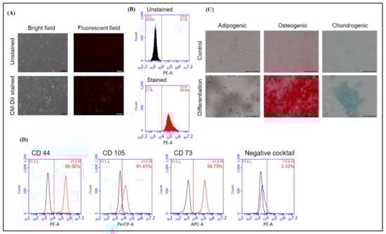 hAFMSCs (0.5–1 × 107) were trypsinized and labeled with an hMSC-positive cocktail containing CD105 PerCP-Cy5.5, CD73 APC, and CD44 PE antibodies (Becton Dickinson, BD, Franklin Lakes, NJ, USA). Subsequently, the hAFMSCs were labeled with an hMSC-negative cocktail containing CD34 PE, CD11b PE, CD19 PE, CD45 PE, and HLA-DR PE (BD) to identify potential contaminants. Next, the cells were incubated on ice for 30 min and washed twice with Perm/Wash buffer (BD). Finally, at least 10,000 cells were analyzed using an Accuri C6 plus flow cytometer (BD) to determine the surface markers and used CSampler™ Plus software version 1.0.27.1 (BD) to correct the fluorescent compensation [56,57].