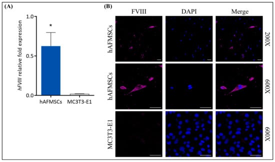 Assessment of FVIII expression in hAFMSCs. (A) The relative fold expression of FVIII mRNA was 0.6252 ± 0.1483 (n = 4) in hAFMSCs, as detected via quantitative RT-PCR (Q-RT-PCR), whereas in MC3T3-E1 cells, it was 0.0198 ± 0.0013 (n = 3), where FVIII could not be detected. FVIII mRNA expression was normalized to β-actin, with a p-value of 0.019 (* p < 0.05). (B) Immunofluorescence staining of hAFMSCs and MC3T3-E1 cells using a FVIII antibody and scanning with a confocal microscope revealed the presence of the FVIII signal in hAFMSCs, while no signal was observed in MC3T3-E1 cells. The original magnifications were 200× and 600×, with a scale bar of 50 μm.