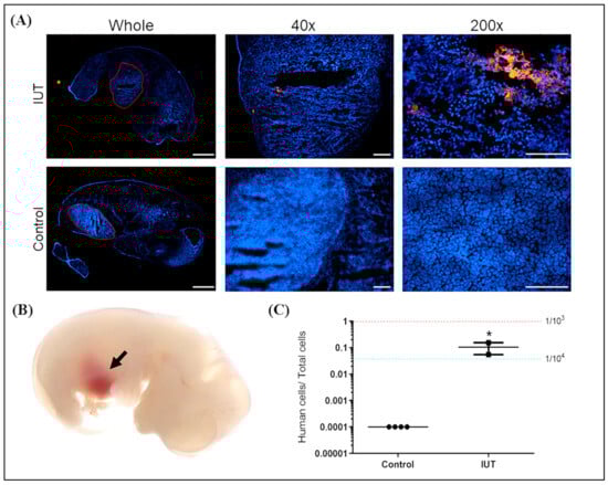 Analysis of human DNA and cells in a recipient mouse fetus. (A) Three days after the recipient fetus was injected with hAFMSCs, it was taken out from the uterus, and red fluorescent cells in the liver were observed under the microscope. The original magnifications were 4×, 40×, and 200×, and the scale bars were 1000 μm, 200 μm, and 100 μm, respectively. (B) Representative image of a fetal liver with brown color indicated by the black arrow after hAFMSC transplantation. (C) Quantitative PCR (Q-PCR) can detect human DNA in the liver of the IUT recipient fetus (n = 2), which was approximately one human cell in a thousand mouse cells, significantly higher than that of the controls (n = 4). The red and blue dashed lines represent the signal from one human cell among 103 and 104 mouse cells, respectively, with a p-value of 0.034 (* p < 0.05).