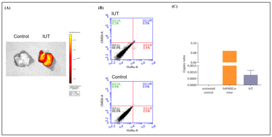 Human stem cells were detected in the livers of recipient mice. (A) Mouse livers were collected and detected for red fluorescence via an in vivo imaging system (IVIS). The results showed that the livers of the recipient mice exhibited obvious red fluorescence, while the livers of the control mice displayed no fluorescence. The scale is the calibrated units, which are expressed as “Photons per Second”. (B) Mouse liver single cells were stained with FITC-conjugated human nuclear (HuNu) antibody and analyzed via flow cytometry. Double-positive fluorescent cells were expressed in IUT-treated mice, whereas no fluorescent cells were detected in control mice. (C) The human-specific gene HBB was detected in the livers of recipient mice via digital droplet-PCR (ddPCR). Copy ratios were divided by HBB by the human–mouse conserved gene TFPA2A. The copy ratio of the IUT group was 0.000786 ± 0.000158 (n = 5); the standard control was the gDNA of hAFMSCs only and hAFMSCs diluted in mouse liver gDNA; the negative control was mouse liver gDNA.