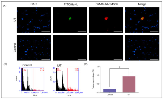 To validate cell fusion between transplanted human stem cells and host mouse cells, single-cell chromosome number and human cell colocalization were assessed in mouse liver tissues obtained from the 13-week-old recipient mice. Liver sections from the recipient mice were used to study human cells. Liver sections were stained with the FITC-conjugated HuNu antibody and observed under a fluorescence microscope. FITC and CMDiI signals were detected in the livers of recipient mice but not in the livers of untreated mice (Figure 5A). Furthermore, to confirm the chromosome number of fused cells, individual liver single cells were stained with PI and analyzed via flow cytometry. More than 2N and 4N chromosomes were detected in the IUT group. In contrast, only 2N and 4N chromosomes were detected in the control group (Figure 5B). The number of chromosomes over 4N in the IUT group was 0.93 ± 0.18, which was significantly higher than that in the control group, 0.20 ± 0.00 (p < 0.05) (Figure 5C). These data indicated that transplanted hAFMSCs could be retained in the livers of IUT mice and fused with mouse liver cells.