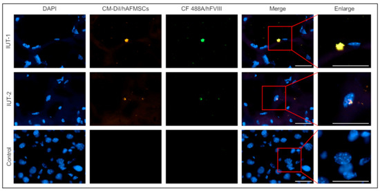 Identification of human cells and human FVIII expression in the livers of IUT recipient mice via immunofluorescence staining. The mouse liver tissue sections were stained with human FVIII (hFVIII) antibodies. The recipient mice livers can discern the hFVIII and transplanted human cells double fluorescent signal. In opposition, there were no hFVIII protein and human cells in the livers of untreated mice. The original magnification was 600×; the scale bar was 30 μm.