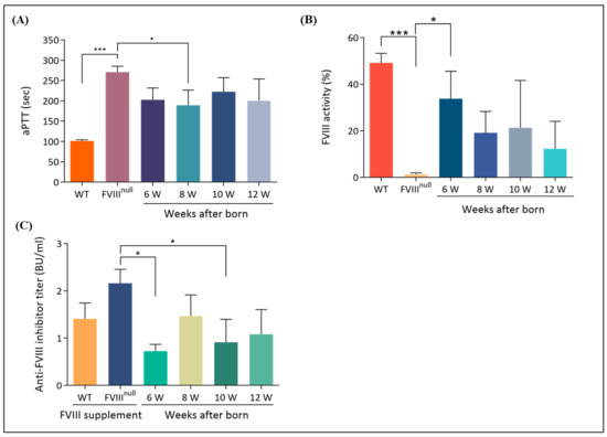 Improvement of coagulation problems in recipient mice. (A) The activated partial thromboplastin time (aPTT) test was used to evaluate the restoration of coagulation problems in recipient mice. The normal control was B6 mice, and the abnormal control was untreated F8KO mice. Clotting time was verified with citrated blood, which was lower in 6-, 8-, and 12-week-old recipient mice than in untreated F8KO mice. (B) FVIII activity was examined via a chromogenic assay. FVIII activity was detected in recipient mice and was significantly higher in 6-week-old mice than in untreated F8KO mice. (C) FVIII inhibitors were tested using a modified Nijmegen–Bethesda assay. Recipient mice were evaluated between 6 and 12 weeks of age, and blood samples were collected from the submandibular vein. The results demonstrated low levels of FVIII inhibitors during this period, with a significant decrease in 6-week-old mice compared to untreated F8KO mice. Bar graphs are presented as the mean ± SEM, and statistical analysis was performed using the one-way ANOVA and post-hoc LSD tests (* p < 0.05; *** p < 0.001).
