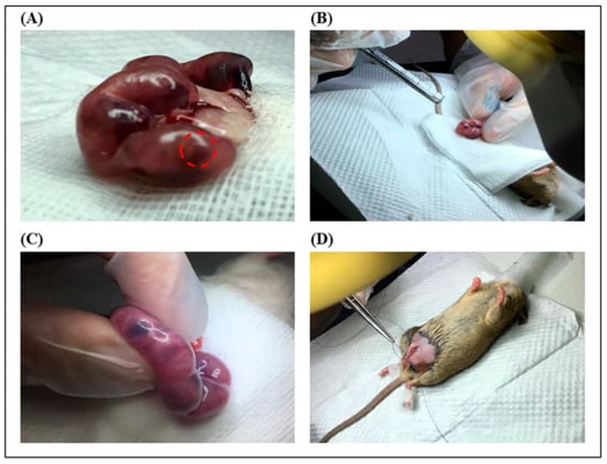 In utero transplantation (IUT) was performed using FVIII KO female mice on day 14.5 of gestation. A total of 1 × 106 hAFMSCs were trypsinized and stained with 3 μL of CMDiI prior to being used for IUT. After staining, the cells were resuspended in 50 μL of indigo carmine DPBS to allow for observations of the cells during IUT manipulation. The IUT operating procedures have been described below. First, the mice were anesthetized with 1.4% atm isoflurane; the abdominal hair was shaved; the skin was disinfected with povidone–iodine and 75% ethanol, and carprofen (China Chemical & Pharmaceutical Co., Taipei, Taiwan) was injected subcutaneously. Second, a ventral incision was made, and the entire uterus was pulled out and rinsed with warm saline. Next, 1 × 105 CMDiI-stained hAFMSCs were injected into the liver of the fetus using a microsyringe (Hamilton Co, Anaheim, CA, USA). After IUT injection, it was important to confirm that the liver of the fetus was stained blue to ensure that the hAFMSCs were precisely injected into the liver. After confirmation, the uterus was returned to the abdominal cavity and rinsed with warm saline. Finally, the incision was sutured with catgut, and the mouse was put back into the cage for follow-up observation (Figure 8). The specify analyses were performed on each mouse were shown in the Supplementary Table S3.