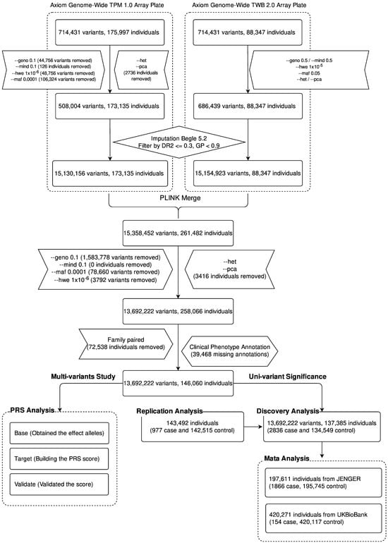 Before performing the imputation, we first constructed a haplotype reference panel and preprocessed SNV array data. From the whole-genome sequence (WGS) reference panels for the TPMI and TWB, we filtered out variants with a minor allele count (MAC) of <3, missing genotypes, multiple alleles (other than SNP/INDEL), and a Hardy–Weinberg equilibrium p value of <10−7 and then phased these reference panels by using SHAPEIT2 []. Using the pre-phasing WGSs of 1363 participants from the TWB as reference panels, we applied SHAPEIT4 to phase TPMI and TWB arrays. Finally, we performed imputation using Beagle5.2 [], which is more effective and accurate than other imputation tools. The imputed data were filtered using an R-square alternate allele dosage of <0.3 and a genotype posterior probability of <0.9 as the criteria []. The SNPs present on the TPMv1 and TWB2 chips are identical; the discrepancy in naming arises from the chips being produced by different entities.