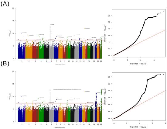 To validate variants detected from the summary statistics, we performed a fixed-effect meta-analysis based on three cohorts, namely the UK Biobank participants of European ancestry (154 cases and 420,117 controls; Pan-UKB team, https://pan.ukbb.broadinstitute.org, accessed on 30 November 2021) [], the Japan Biobank (BBJ) participants of Japanese ancestry (1866 cases and 195,745 controls) [], and the CMUH-TWB participants of Han Chinese ancestry. We used METAL with the sample size “effective N” as the weight for each cohort []. We transformed all the variants of the BBJ, UK Biobank, and our study to the rsID of dbSNP v.153 to determine significant variants before performing the meta-analysis to prevent the database difference between hg37 and hg38.