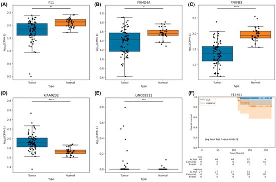 Results of novel SNP loci-related gene expression and survival between HCC and noncancerous tissues collected from Taiwanese patients with HCC and from TCGA: (A) F11 gene expression. (B) FMRD4A gene expression. (C) PFKFP3 gene expression. (D) KIAA0232 gene expression. (E) LINC02511 gene expression. (F) F11-AS1 survival analysis. *: 0.01 < p ≤ 0.05; **: 10−3 < p ≤ 0.01; ***: 10−4 < p ≤ 10−3; ****: p ≤ 10−4
