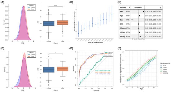 Results of PRS analysis: (A) The PRS distribution and statistical results of the target group. Left, the PRS distribution (the X axis: normalized PRS, Y axis: density); right, the statistical results for HCC cases and controls. (B) The odds ratio of PRS stratification with percentile. The 40–50 percentile was used as a reference to compare other groups to calculate the odds ratio, and 95% CI is shown as a line. (C) The PRS distribution and statistical results of the validate group. Left, the PRS distribution (the X axis: normalized PRS; Y axis: density); right, the statistical results for HCC cases and controls. (D) The ROC curve of the validate group. PRS only: only PRS was used in modeling; combined: using PRS, demography (age, sex, and BMI), and bioclinical data (Albumin, HBV surface antigen, and HCV antibody) in model building. (E) The forest plot of the odds ratios of covariants in the combined model with 95% CI. (F) Predicted HCC cancer risk by quintile stratification of HCC cancer PRS with increase in age. *: 0.01 < p ≤ 0.05; ****: p ≤ 10−4. “N” is the number of samples, and “p” is the statistical value (Odds ratio, 95% CI, p-value).