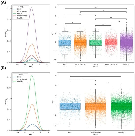 Results of PRS distribution and statistical difference between the members of the cancer family and noncancer family: (A) The distribution of PRS in different groups (left); the significant difference between groups is shown (right). HCC: one person in the family with HCC; Other Cancer: one person in the family with cancer (not HCC); HCC+: more than one person in the family with HCC and other cancers; Other Cancer+: more than one person in the family with cancer (not HCC); Healthy: no member in the family with cancer. (B) The distribution of PRS for HCC, other cancer (non-HCC), and healthy groups (left); the statistical difference between the different groups is shown (right). *: 0.01 < p ≤ 0.05; **: 10−3 < p ≤ 0.01; ***: 10−4 < p ≤ 10−3; ****: p ≤ 10−4; ns: not significant.