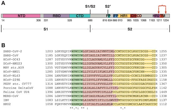 - Howard, M.W.; Travanty, E.A.; Jeffers, S.A.; Smith, M.K.; Wennier, S.T.; Thackray, L.B.; Holmes, K.V. Aromatic amino acids in the juxtamembrane domain of SARS coronavirus spike glycoprotein are important for receptor-dependent virus entry and cell–cell fusion. J. Virol. 2008, 82, 2883–2894. [Google Scholar] [CrossRef] [PubMed]