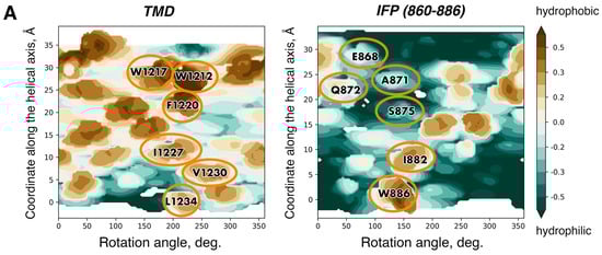 - Efremov, R.G.; Gulyaev, D.I.; Vergoten, G.; Modyanov, N.N. Application of three-dimensional molecular hydrophobicity potential to the analysis of spatial organization of membrane domains in proteins: I. Hydrophobic properties of transmembrane segments of Na+, K+-ATPase. J. Protein Chem. 1992, 11, 665–675. [Google Scholar] [CrossRef] [PubMed]
