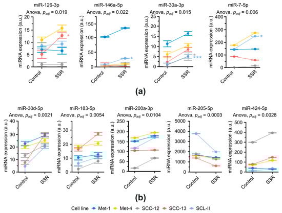 In total, nine miRNAs were differentially expressed post-irradiation (Figure 1) with upregulation of eight miRNAs and downregulation of one miRNA. Two mechanisms of differential expression could be observed, as indicated by two-way ANOVA. The first set of miRNAs showed a significant interaction term, suggesting a cell-type-specific radiation response (Figure 1a). This was accompanied by upregulation of four miRNAs, namely miR-126-3p (fdr-adjusted interaction term of two-way ANOVA, padj = 0.019), miR-146a-5p (padj = 0.022), miR-30a-3p (padj = 0.015), and miR-7-5p (padj = 0.006). A post hoc Games–Howell test showed significant differences for miR-126-3p in SCC-13 (p = 0.035), miR-146a-5p in SCL-II (p = 0.010), miR-30a-3p in SCC-12 (p = 0.020) and SCL-II (p = 0.0008), and miR-7-5p in SCL-II (p = 0.039). A second set of miRNAs did not manifest a significant interaction. However, a significant irradiation main effect was evident after two-way ANOVA (Figure 1b), suggesting elements of a universal radiation response. In this set, miR-30d-5p (fdr-adjusted irradiation main effect of two-way ANOVA padj = 0.0021), miR-183-5p (padj = 0.0054), miR-200a-3p (padj = 0.0104), and miR-424-5p (padj = 0.0028) were significantly upregulated, whereas miR-205-5p (padj = 0.0003) was significantly downregulated after irradiation. Due to a lack of significant interaction, no post-hoc tests were applied. Results were corroborated by complementary qPCR validation of the results, showing a high concordance of miRNA expression measured via FirePlex® assay and qPCR (Supplementary Figure S1). In summary, in addition to induction of different types of radiation responses, SSR seems promotive rather than suppressive regarding the control of miRNA expression shown by upregulation of 8 out of 9 miRNAs after SSR exposure.