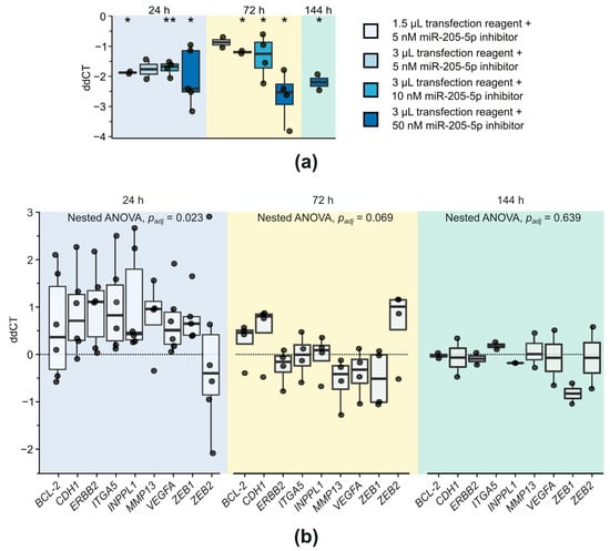 Knockdown of miR-205-5p was examined by via transfection of SCC-12 cells—showing good transfection capabilities—with different concentrations of a miR-205-5p inhibitor and measurement of miR-205-5p expression via qPCR at different time points (Figure 2a). Transfection led to a significant knockdown of miR-205-5p for the combination of 1.5 µL transfection reagent + 5 nM miR-205-5p inhibitor after 24 h (fdr-adjusted two-tailed one-sample t-test with µ = 0, padj = 0.013), 3 µL transfection reagent + 5 nM miR-205-5p inhibitor after 72 h (padj = 0.021), 3 µL transfection reagent + 10 nM miR-205-5p inhibitor after 24 h (padj = 0.003) and 72 h (padj = 0.025), and 3 µL transfection reagent + 50 nM miR-205-5p inhibitor at 24 h (padj = 0.013) and 72 h (padj = 0.013) post-transfection. The latter combination showed the strongest reduction in miR-205-5p expression with a 6-fold decrease 72 h after transfection, which was still observable 144 h post-transfection (padj = 0.048), indicating a durable knockdown of miR-205-5p with this transfection approach. Therefore, for subsequent analyses, cells were transfected with 3 µL transfection reagent and 50 nM miR-205-5p inhibitor.