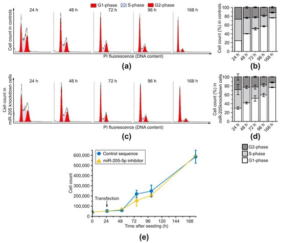 To investigate the potential influence of miR-205-5p on the proliferation properties of cSCCs, a determination of cell growth and a complementary cell cycle analysis were conducted. SCC-12 cells (representing an aggressive phenotype with p53-deficiency (see §3.1)) were transfected with an miR-205-5p inhibitor and analyzed at various time points. Detached and counted cells were subsequently fixed, and DNA content was measured via propidium iodide staining. After miR-205-5p knockdown, no changes in cell cycle distribution were evident (tested by chi2 test on absolute frequencies, Figure 3a–d). Time-dependent changes can be explained by the confluency of cell cultures. The cell growth (Figure 3e) did not differ within the first 48 h, was slightly lower at the time points of 72 h and 96 h miR-205-5p knockdown cells, and then returned to the level of control cells. Testing for differences using Welch’s t-test did not lead to detection of significant changes after fdr adjustment. Overall, no evidence was found that miR-205-5p has an influence on the proliferation properties of cSCCs in vitro.