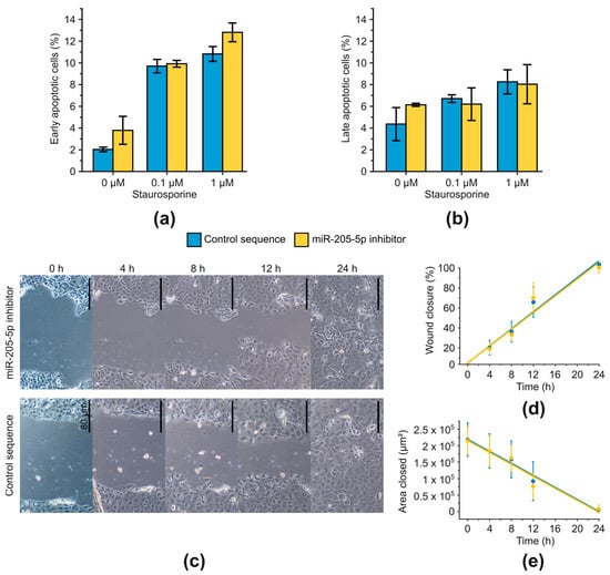 Apoptosis and migration were not affected by miR-205-5p inhibition in SCC-12. (a) Early apoptotic cells. Apoptosis was measured flow cytometrically via annexin V assay. Cells were treated with staurosporine for 3 h before quantification of apoptotic cells. (b) Late apoptotic/necrotic cells. Apoptosis was measured flow cytometrically via annexin V assay. Cells were treated with staurosporine for 3 h before quantification of apoptotic cells. (c) Representative images of a scratch assay. Scratch was induced with a 100 µL pipette tip. Scale bars indicate 80 µm. Wound closure was monitored over a period of 24 h and images were analyzed with the ImageJ plugin wound healing size tool []. (d) Wound closure in percent. (e) Closed scratch area in µm2. Significant differences in slopes of linear regression could not be detected with ANOVA for (d,e). Results are shown as mean ± SD. n = 3.