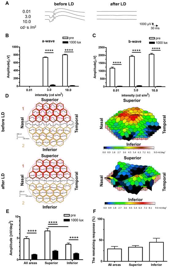 Recordings of ERGs and mfERGs on the LD rats. Typical waveforms of ERGs before and after LD (A). Amplitudes of the a- (B) and b-waves (C) were significantly reduced after LD. Data are presented as the mean ± SEM (pre: n = 8, 1000 lux: n = 8, paired t-test, **** p < 0.0001). Averaged waveforms and 3D density plots, a visualization of the amount of retinal response per unit area, are shown in the left and right panels, respectively (D). The amplitudes recorded from the mfERG were divided into three groups: the whole retina, the superior retina surrounded with red (group 1), and the inferior retina surrounded with gold (group 2). Comparisons of the amplitudes in the superior and inferior retinas are shown in (E). Data are presented as the mean ± SEM (pre: n = 16, 1000 lux: n = 16, paired t-test, **** p < 0.0001). The remaining response, calculated by dividing the amplitude value after LD in the mfERG by the pre-value, is shown in (F). Data are presented as the mean ± SEM (all areas, superior, inferior: n = 16, Dunn’s multiple comparison test). mfERGs, multifocal electroretinograms; LD, light-damaged; SEM, standard error of the mean; 3D, three-dimensional.