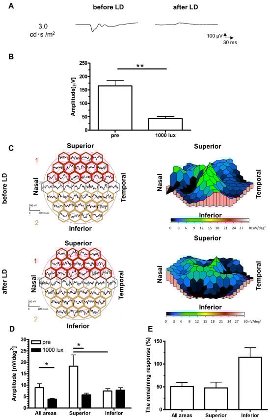 Recordings of VEPs and mfVEPs on the LD rats. Typical waveforms of VEPs before and after LD (A). Comparison of the recorded amplitudes before and after LD (B). Data are presented as the mean ± SEM (pre: n = 8, 1000 lux: n = 8, paired t-test, ** p < 0.01). Averaged waveforms and 3D density plots, a visualization of the amount of retinal response per unit area, are shown in the left and right panels, respectively (C). The amplitudes of the mfVEP were divided into three groups: the whole retina, the superior retina surrounded with red (group 1), and the inferior retina surrounded with gold (group 2). Comparisons of the amplitudes in the superior and inferior retinas are shown in (D). Data are presented as the mean ± SEM (pre: n = 7, 1000 lux: n = 7, unpaired t-test, * p < 0.05). The remaining response was calculated by dividing the amplitude value after LD in mfVEP by the pre-value, as shown in (E). Data are presented as the mean ± SEM (all areas, superior, inferior: n = 7, Dunn’s multiple comparison test). mfVEP, multifocal visual evoked potential; LD, light-damaged; SEM, standard error of the mean; 3D, three-dimensional.