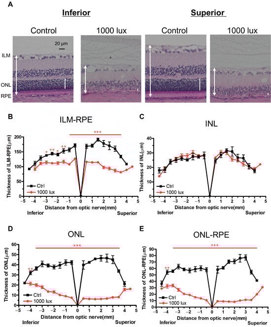 Paraffin-embedded sections prepared from rat eyes two weeks after LD were stained with haematoxylin and eosin (HE) to assess retinal thickness. Compared to the controls, the LD group showed reduced retinal thickness in the inner limiting membrane–retinal pigment epithelium (ILM-RPE), outer nuclear layer (ONL), and photoreceptor layers (Figure 3). Severe photoreceptor degeneration was observed, particularly in the superior retina.