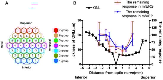 Correlation of histological evaluation with mfERG and mfVEP. As shown in (A), the averaged amplitude of each group from the inferior to the superior regions was calculated, and the values as a percentage of the pre-recorded amplitude were overlaid on the histological thickness (B). Data are presented as the mean ± SEM (1 group~7 group of mfERG: n = 16, 1 group~7 group of mfVEP: n = 7, ONL: n = 24). The position of the retina in each group of mfERG and mfVEP is 1 group: −2.5 mm, 2 group: −1.5 mm, 3 group: −1.0 mm, 4 group: 0 mm, 5 group: 1.0 mm, 6 group: 1.5 mm, 7 group: 2.5 mm. SEM, standard error of the mean; mfERG, multifocal electroretinogram; mfVEP, multifocal visual evoked potential; ONL, outer nuclear layer.
