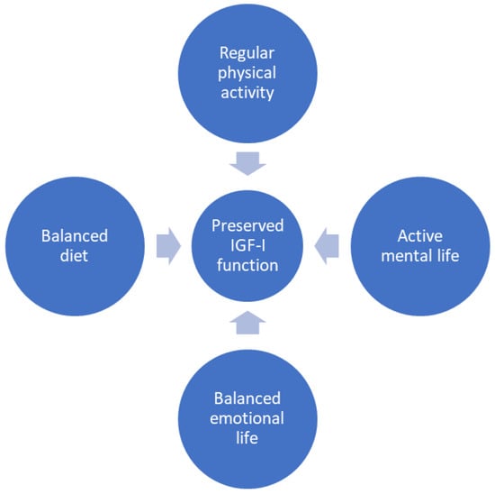 Accordingly, several lines of research are trying to shed light on AD resilience, as it appears very promising to develop novel routes of AD therapy. For example, early life context [], aerobic glycolysis [], efficient microglial phagocytosis [], and dendritic spine plasticity [] have all been suggested to contribute to resilience/vulnerability to AD. Therefore, understanding the underlying mechanisms will unveil new potential targets in AD prevention. In this vein, while no general consensus has yet been reached, and the major conclusions indicate that further work is needed to firmly establish a causal link between circulating IGF-I levels and cognition [], available information allows us to suggest that preserved brain IGF-I activity also contributes to resilience to AD pathology. Thus, all the major characteristics found in individuals resilient to AD can be explained in the light of preserved brain IGF-I activity. These include conserved neuronal numbers, synaptic markers, and axonal architecture, as well as cytokine profiles consisting of higher anti-inflammatory signals and neurotrophic factors, and lower cytokine mediators of microglial recruitment [,]. Indeed, recent ideas supporting a multifactorial approach to treating cognitive loss in dementia [] can be accommodated in our proposal if we consider these multi-pronged measures as a means to preserve brain IGF-I activity, such as through behavior (Figure 1).