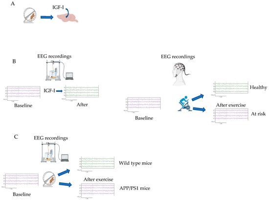 Indirect determination of IGF-I activity in the brain using electro-encephalographic (EEG) responses to exercise as a surrogate. The proposed test is based on three observations in mice: (A) Exercise induces the entrance of circulating IGF-I into the brain []. (B) Circulating IGF-I modulates EEG patterns []. (C) Absence of exercise-induced changes in EEG patterns in mildly cognitively impaired APP/PS1 mice []. Right panel: the proposed test for measuring brain IGF-I activity in humans consists of EEG recordings at rest, followed by a bout of moderate exercise and subsequent EEG recordings. The prediction is that subjects showing no EEG changes after exercise are at risk of developing cognitive disturbances. The purported explanation is that IGF-I activity is lower in the brains of these subjects.