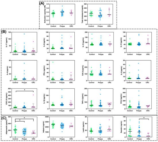 - Joshi, R.K.; Kim, W.J.; Lee, S.-A. Association between Obesity-Related Adipokines and Colorectal Cancer: A Case-Control Study and Meta-Analysis. World J. Gastroenterol. 2014, 20, 7941–7949. [Google Scholar] [CrossRef] [PubMed]