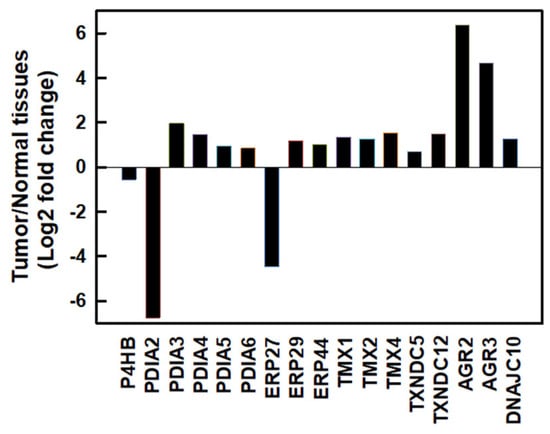 The mRNA expressions of protein disulfide isomerase (PDI) family members in human pancreatic ductal adenocarcinoma (PDAC) tissues. mRNA levels of human PDAC tissues and normal pancreatic tissues were obtained from the GEPIA2 database. PDI family members were selected based on a |log2(fold change)| cutoff of 0.5 and q-value cutoff of 0.01. PDAC tissues, n = 179; normal pancreatic tissues, n = 171.