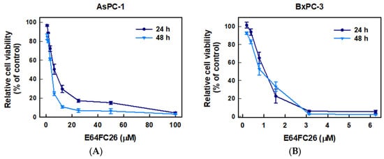 Effects of E64FC26 on the cell viability in human pancreatic ductal adenocarcinoma (PDAC) cells. (A) AsPC-1 and (B) BxPC-3 cells were treated with different concentrations of E64FC26 for 24 and 48 h, and cell viability was determined by an MTT assay. Each data point is presented as the mean ± S.E. of three independent experiments.