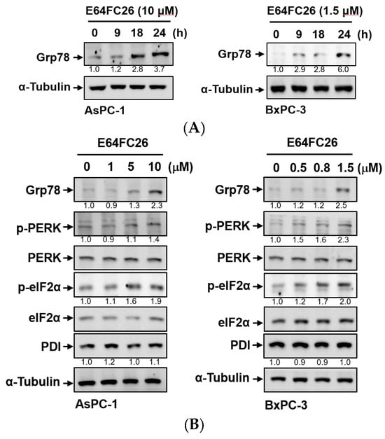 Effects of E64FC26 on endoplasmic reticular (ER) stress- and unfolded protein response (UPR)-related protein expressions in human pancreatic ductal adenocarcinoma (PDAC) cells. (A) AsPC-1 and BxPC-3 cells were treated with E64FC26 for different times, and protein levels of ER stress-related proteins were determined by Western blotting. (B) AsPC-1 and BxPC-3 cells were treated with different concentrations of E64FC26 for 24 h, and protein levels of ER stress-related proteins were determined by Western blotting. The relative mean intensity of each band (indicated below the bands, n ≥ 3) was normalized to the unphosphorylated total protein (including PERK, eIF2α) or α-tubulin loading control.
