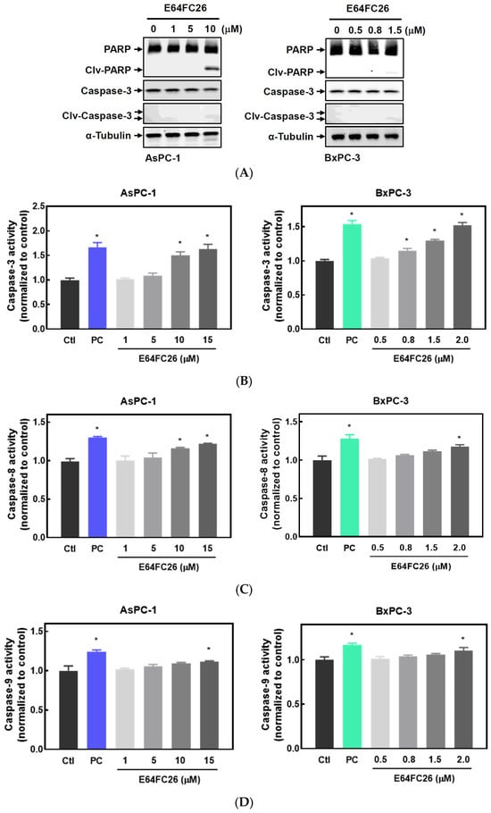 Effects of E64FC26 on activation of caspases in human pancreatic ductal adenocarcinoma (PDAC) cells. (A) AsPC-1 and BxPC-3 cells were treated with different concentrations of E64FC26 for 24 h, and protein levels of the poly(ADP ribose) polymerase (PARP) and caspase-3 proteins were determined by Western blotting. (B–D) AsPC-1 and BxPC-3 cells were treated with different concentrations of E64FC26 for 24 h, and activities of (B) caspase-3, (C) caspase-8, and (D) caspase-9 were detected with a caspase colorimetric assay kit. Concentrations of 1 µM and 100 nM of staurosporine were respectively used as positive controls (PCs) in AsPC-1 and BxPC-3 cells. Each data point is presented as the mean ± S.E. of three independent experiments. * p < 0.05 vs. the control (Ctl) group.