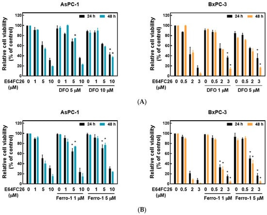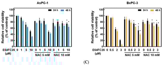 Effects of ferroptosis inhibitors on E64FC26-caused cell death in human pancreatic ductal adenocarcinoma (PDAC) cells. AsPC-1 and BcPC-3 cells were pretreated with (A) deferoxamine (DFO) for 6 h, (B) ferrostatin-1 (Ferro-1) for 1 h, or (C) N-acetylcysteine (NAC) for 24 h, and then treated with E64FC26 for 24 or 48 h. Cell viability was determined by an MTT assay. Each data point is presented as the mean ± S.E. of three independent experiments. * p < 0.05 vs. the E64FC26 alone group.