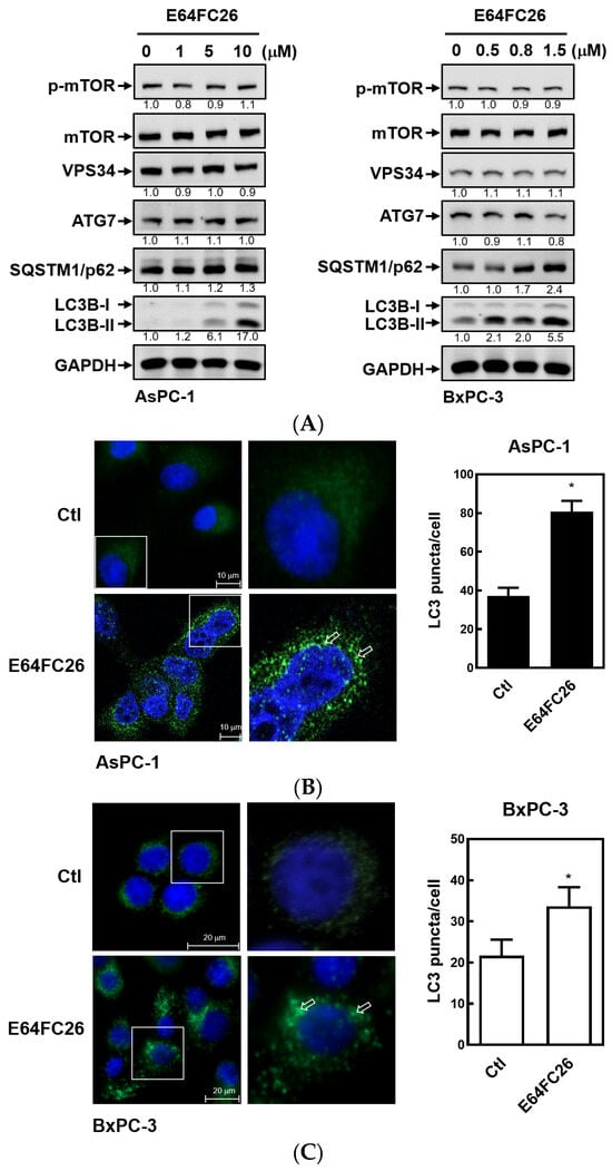 Effects of E64FC26 on autophagy marker protein expressions in human pancreatic ductal adenocarcinoma (PDAC) cells. (A) AsPC-1 and BxPC-3 cells were treated with different concentrations of E64FC26 for 24 h, and protein levels of autophagy-related proteins were determined by Western blotting. The relative mean intensity of each band (indicated below the bands, n ≥ 3) was normalized to the unphosphorylated total protein (mTOR) or GAPDH loading control. (B) AsPC-1 and (C) BxPC-3 cells were respectively treated with 5 and 1 µM of E64FC26 for 24 h, and the light chain 3B (LC3B) puncta were detected by IF staining with the CF®488A dye (green) and nucleic acid staining with DAPI (blue). Images on the right column are magnifications of the white boxed areas. Representative LC3B puncta are indicated by white arrows. Quantification of LC3 puncta per cell is presented as the mean ± S.E. of three independent experiments. * p < 0.05 vs. the control (Ctl) group.