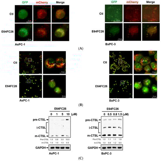 Effects of E64FC26 on autolysosome formation and lysosome functions in human pancreatic ductal adenocarcinoma (PDAC) cells. (A) AsPC-1 and BxPC-3 cells were transfected with the FUW mCherry-GFP-LC3 plasmid and then treated with 5 µM and 1 µM E64FC26, respectively, for 24 h. Autophagosomes/autolysosomes were visualized by fluorescence microscopy. Representative autolysosomes and autophagosomes are indicated by red and yellow arrows, respectively. (B) AsPC-1 and BxPC-3 cells were treated with 5 µM and 1 µM E64FC26, respectively, for 24 h, and cells were stained with acridine orange for 15 min. Under acridine orange staining, cytoplasmic and nuclear fluorescence was green, and acidic vesicular organelle fluorescence was bright red or orange-red. Images on the right column are magnifications of the white boxed areas. Representative mature lysosomes or acidic autolysosomes are indicated by white arrows. (C) AsPC-1 and BxPC-3 cells were treated with different concentrations of E64FC26 for 24 h, and the precursor (pre-), intermediate (i-), and mature (m-) forms of the cathepsin L (CTSL) protein were detected by Western blotting. The relative mean intensity of each band (indicated below the bands, n ≥ 3) was normalized to the GAPDH loading control.