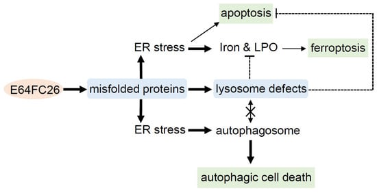 Possible mechanisms of E64FC26-induced cell death in pancreatic ductal adenocarcinoma (PDAC) cells. E64FC26 first induced endoplasmic reticular (ER) stress through impeding proper folding of proteins, and then subsequently caused lysosome defects. ER stress might have initiated ferroptosis and autophagy signals, and cells may have undergone partial apoptosis due to persistent ER stress from higher E64FC26 concentrations. However, defective lysosomes were unable to assist in the apoptosis and ferroptosis processes and hindered fusion with autophagosomes to form autolysosomes. Finally, E64FC26 only induced limited apoptosis and ferroptosis and mainly caused autophagic cell death. Solid lines are used to indicate activated pathways, and dashed lines are used to indicate inhibited pathways. LPO, lipid peroxidation.