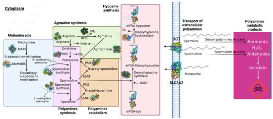 PA transport and metabolism. GPC1 transports spermine, putrescine is exported by the transporter SLC3A2, and spermine and spermidine are transported through OCT–1–3. In the first stage of PA synthesis, ornithine and agmatine are synthetized from arginine catalyzed by arginase and ADC, respectively. Agmatine can be transformed into putrescine and urea by agmatinase. Ornithine is then decarboxylated by ODC to synthetize putrescine and urea. Subsequently, putrescine is converted into spermidine and spermidine is converted into spermine by the action of spermidine synthetase and spermine synthetase, respectively. Spermidine is cleaved and transferred by DHS to eIF5A-Lys to catalyze the interconversion of deoxyhypusine, which is subsequently hydroxylated by DOHH to produce hypusine. In a second stage, dcAdoMet suffers a decarboxylation catalyzed by S–adenosine methionine decarboxylase (pyruvoyl), producing S–adenosine methionine–3–aminopropyl methyl sulfonate. The catabolism pathway of PA successively converts spermine into spermidine and spermidine into putrescine through the acetylated forms of PA (N–acetylspermine and N–acetylspermidine) catalyzed by SSAT and PAO. The degradation of PA leads to the production of highly toxic intermediaries such as aldehydes, peroxides, and ammonia. In particular, aldehydes are extremely reactive and degrade spontaneously, producing acrolein, a highly toxic compound.