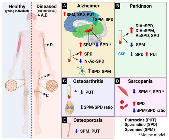 Alterations of polyamine concentration in various age-related diseases. (A) Alzheimer’s disease: Predominantly increased polyamines are observed in the brain: SPM, SPD, and PUT increase in the frontal lobe (navy blue); SPM and SPD increase in the parietal lobe (light blue); SPD increases in the temporal lobe (green); and SPM increases while SPD decreases in the hippocampus of mice. In plasma, there is an increase in SPD and a decrease in its acetylated form, N-Ac-SPD. Glial cells show increases in SPD and SPM. (B) Parkinson’s disease: Acetylated forms of SPD, SPM, and SPD exhibit higher concentrations, along with an increase in SPD and a decrease in SPM in plasma. There is an increase in SPD and decreases in SPM and PUT in blood. PUT increases and SPD decreases in cerebrospinal fluid. Glial cells exhibit increases in SPD and SPM. (C) Osteoarthritis: PUT decreases in plasma, and SPM decreases at the knee. (D) Sarcopenia: SPM and SPD decrease in the muscle, while there is an increase in SPD and a decrease in SPM in blood. (E) Osteoporosis: There are decreases in SPD and PUT in osteoporotic bones. Labels indicate putrescine (PUT), spermidine (SPD), spermine (SPM), and their acetylated versions (Ac) either at the amino terminus (N-) or di-acetylation (Di). A higher concentration is indicated by a red arrow, while a lower concentration is denoted by a blue arrow, compared to healthy individuals. * Refers to studies using murine models.