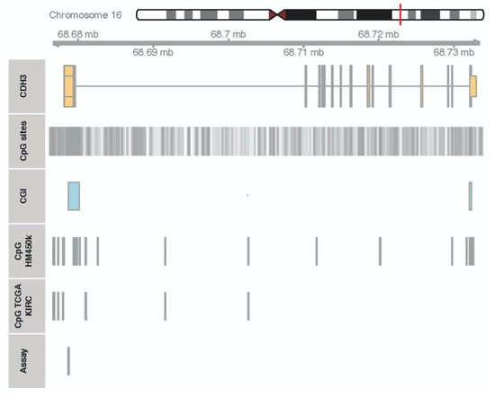 Cadherins are a class of transmembrane proteins that contribute to cell–cell adhesion in epithelial tissues—for example, in the esophagus, kidney tubules, urinary bladder, prostate, and intestines—by forming junctions and maintaining tissue integrity. Extracellular cadherin domains are known to mediate cell–cell adhesion. Cadherin 3 (CDH3, P-cadherin) has been detected in the basal layer of stratified epithelia in the placenta, epidermis, breast, and prostate [18]. Epigenetic alternations of CDH3 with concurrent alterations in CDH3 protein expression have been correlated with adverse histopathology in a variety of cancers, such as breast, cervical, ovarian, pancreatic, gall bladder, colorectal, hepatocellular, and oral squamous cancers [18,19,20,21,22,23,24,25]. Consequently, blocking the activity of CDH3 and the associated signaling has been discussed as a novel therapeutic approach for treatment [26,27,28,29]. In other urological malignancies, including bladder and prostate cancer, CDH3 has been shown to be negatively regulated at the genomic and transcriptional levels and associated with poor clinical outcomes [30,31]. However, how CDH3 promotes malignant transformation in different organs remains unknown. It has been shown by means of immunohistochemistry (IHC) and real-time PCR that RCCs express a complex set of cadherins, including E-cadherin (CDH1), N-cadherin (CDH2), and cadherins 4, 6, and 11, whereas no CDH3 was detected [32]. Hence, the particular role of each of these cadherins in the pathogenesis of RCC is not completely understood. The presence of two CpG islands (CGIs) within the region of chromosome 16q22.1 that includes CDH3 (Figure 1) has led to the hypothesis that CGI hypermethylation might decrease CDH3 expression and, in turn, facilitate the malignant transformation of renal tissue.