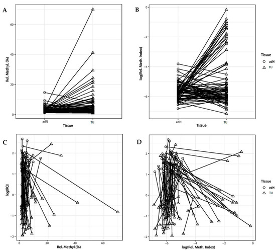To compare the degree of DNA methylation in RCC and paired adN, the two-tailed paired t-test was applied. The relative degree of methylation was calculated according to Weisenberger [48,49]. Possible associations of the degree of methylation and clinicopathological variables of patients such as localized vs. advanced disease, state of lymph node metastasis (N0 vs. N+), absent and present distant metastasis (M0 vs. M+), and tumor differentiation (low grade G1 and G1-2 vs. high grade G2-3 and G3) were analyzed using logistic regression analysis. R statistical software (version 3.6) was used to perform all statistical analyses. p values ≤ 0.05 were considered to be statistically significant. In silico analyses were performed by querying the TCGA-KIRC database [7]. The association of relative methylation and clinicopathological parameters was carried out by logistic regression analysis as described above. A Pearson’s correlation analysis was carried out for the detection of associations between mutational status, mRNA expression levels, and degree of CpG-specific methylation. Multivariate Cox proportional hazard models were generated to estimate the hazard ratios in the overall survival analysis. Adjustments for multiple statistical testing used the Benjamini–Hochberg correction.