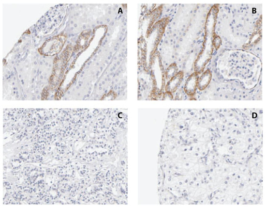 In addition, we examined the immunohistochemical data published by the Human Protein Atlas [33]. There, using antibody HPA001767, 10/11 (90.91%) RCC tissues displayed no signal, while 1/11 (9.09%) showed low positivity in histological areas affected by cancer lesions. In sections stained using the antibody CAB002487, 11/12 (91.67%) RCC tissues showed no signal, whereas 1/12 (8.33%) had medium positivity. In contrast, pronounced immunopositivity could be seen in normal renal cortex in collecting ducts and distal tubules, with medium staining intensity in 3/3 samples (100%) stained using HPA001767 and with high intensity in cells in tubules in 3/3 samples (100%) stained with CAB002487 (Figure 5). Applying Fisher exact statistics to both immunohistochemical analyses, we found that the null hypothesis of no staining differences between normal and tumor tissues was rejected for both antibodies (p < 0.02; p < 0.01).