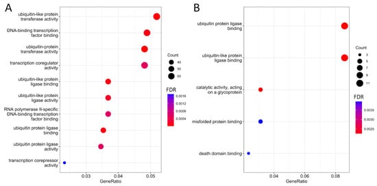 It is noteworthy that genes for which possible m6A sites were common for all technical replicates maintained associations with ubiquitination processes, such as “ubiquitin protein ligase binding” (FDR = 0.002) and “ubiquitin-like protein ligase binding” (FDR = 0.003) (Figure 1B), as well as protein binding processes, including “misfolded protein binding” (FDR = 0.004) and “death domain binding” (FDR = 0.004) (Figure 1B).