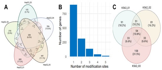 The distribution of detected m6A modification sites. (A) Overlap among the five technical replicates for the HepG2 cell line; (B) histogram of the number of m6A sites in protein-coding genes for the HepG2 cell line; (C) overlap among three technical replicates for the K562 cell line (public data were downloaded from Singapore Nanopore Expression Project [20]).