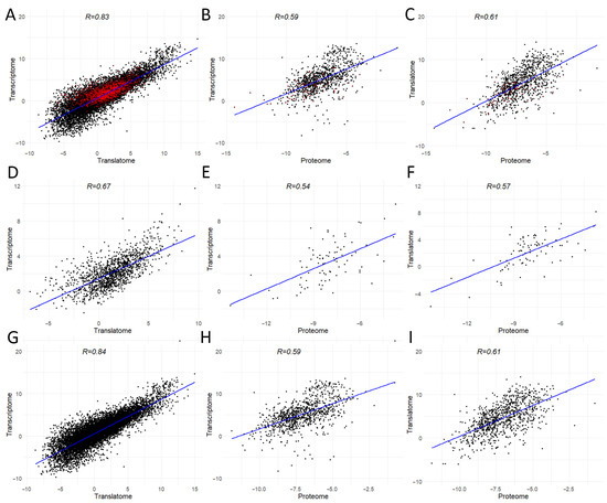 The correlation plots between transcriptomic, translatomic, and proteomic levels are presented in the following: (A–C) Correlation between all genes across the three levels of genetic information expression. Genes in the transcripts of which m6A modification sites were detected are highlighted in red. (D–F) Correlation between all genes with m6A modification sites across the three levels. (G–I) Correlation between all genes except those in the transcripts of which m6A modifications were detected. Expression levels are displayed in logarithmic values: log2(TPM) for transcriptome and translatome and log2(NSAF) for proteome.