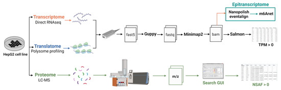 The transcriptome and proteome data were described in Pytnitskiy et al. [19] and Poverennaya et al. [21], respectively. We utilized data from the same HepG2 cell line. The raw sequencing data for the HepG2 transcriptome were deposited in the NCBI SRA (https://www.ncbi.nlm.nih.gov, accessed on 1 September 2023) under accession number PRJNA765908. The raw proteome data were uploaded to Mendeley Data (https://data.mendeley.com/, accessed on 1 September 2023). Data for the K562 cell lines were obtained from the Singapore Nanopore Expression Project (https://github.com/GoekeLab/sg-nex-data, accessed on 29 October 2023) [20]. The overall workflow of the experiment, during which m6A RNA modifications were discovered and gene expression was detected at the transcriptomic, translatomic, and proteomic levels, is presented in Figure 5. Transcriptome and translatome profiling were analyzed using the same protocol. Basecalling was performed using Guppy (version 6.2.1). The resulting fastq files were aligned using the long-read aligner Minimap2 (“-ax map-ont” mode, version 2.24) [33]. Gene expression and isoform analysis were performed using Salmon [34]. Expression of each transcript was quantified in transcript per million (TPM) units, giving relative abundance. Gene expression was calculated by summing all the TPM values of corresponding transcripts.
