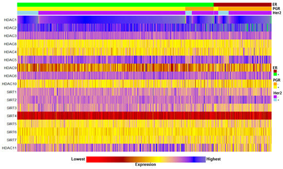 Generation of heatmap illustrating color-based graphical representation for genomic expression profiles of 18 different epigenetic enzymes (HDACs and SIRTs). TCGA pan-cancer normalized RNA-Seq datasets for cancerous (1095 tumors) and cancerous (139 specimens) breast tissues. ER, PGR (progesterone receptor), and Her2 categories are depicted on right side of the heatmap. These cancerous and non-cancerous breast tissues include ER+, ER−, PGR+, PGR−, Her2+, and Her2− subtypes. Bottom rectangular bar with ‘red’ and ‘blue’ colors at both ends represents the lowest and highest expression levels, respectively.