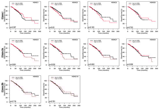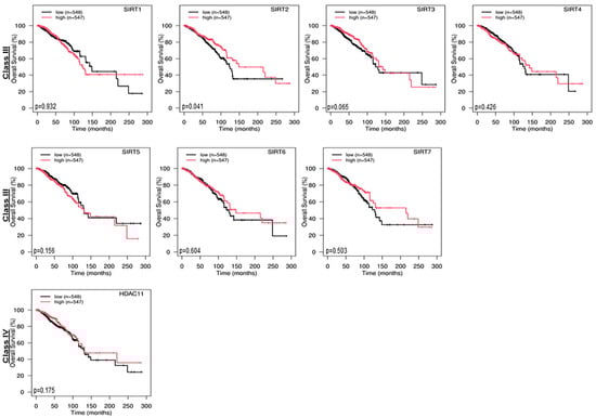 To better understand the influence of aberrant regulation of epigenetic enzymes on the overall survival of BC patients, Kaplan–Meier curves were generated using TCGA RNA-Seq datasets involving higher (548 tumors) and lower (547 tumors) expression of those genes. The results presented in Figure 2 demonstrated that dysregulated expression of various epigenetic enzyme genes was not correlated, with the exception of HDAC2 (p = 0.03) and SIRT2 (p = 0.04), with the overall survival of patients afflicted with BCs. Notably, HDAC2 (Class I) and SIRT2 (Class III) were found to be increased and decreased in TCGA breast tumors, respectively. On the other hand, there was no significant relationship between overall survival rates and the dysregulation of other epigenetic enzyme genes: Class I, HDAC1 (p = 0.397), HDAC3 (p = 0.183), and HDAC8 (p = 0.783); Class IIa, HDAC4 (p = 0.891), HDAC5 (p = 0.935), HDAC7 (p = 0.802), and HDAC9 (p = 0.699); Class IIb, HDAC6 (p = 0.718) and HDAC2 (p = 0.781); Class III, SIRT1 (p = 0.932), SIRT3 (p = 0.065), SIRT4 (p = 0.426), SIRT5 (p = 0.156), SIRT6 (p = 0.604), SIRT7 (p = 0.503); and Class IV, HDAC11 (p = 0.175) (Figure 2). Clearly, while most of these epigenetic enzymes were dysregulated in BCs, their genomic expression levels did not correlate with the overall survival of BC patients. It is conceivable that an imbalance in epigenetic signaling presumably modulates diverse factors and hormone receptors that influence cholesterol trafficking and metabolism and promote estrogen/E2 accumulation, which is detrimental for the progression of breast carcinogenesis.