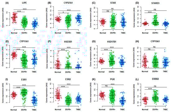In additional analyses, we studied the genomic expression levels of a total of 12 important factors including hormone receptor markers and steroidogenic enzymes, which play crucial roles in cholesterol availability for steroidogenesis and the progression of BCs [23,31,32]. To evaluate such relationships, TCGA breast tissues were categorized into three groups, i.e., Normal, ER+/PR+, and TNBCs, and the targeted factors chosen were based on their influence in regulating steroidogenesis, emphasizing estrogen and/or E2 biosynthesis [9,10,11,12,13]. As illustrated in boxplots (Figure 3), genomic analyses of the TCGA pan-cancer normalized BC datasets displayed diverse expression levels of these key factors, i.e., LIPE (A), CYP27A1 (B), STAR (C), STARD3 (D), CYP11A1 (E), HSD3B1 (F), HSD17B1 (G), CYP19A1 (H), ESR1 (I), ESR2 (J), PGR (K), and ERBB2 (L). Genomic expression of these factors was found to be increased, decreased, or unaltered in TCGA BC subtypes compared with their non-cancerous counterparts, suggesting they differently influence estrogen-induced breast tumorigenesis.