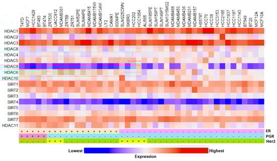 Generation of the heatmap illustrating color-based graphical representation for genomic expression of 18 different epigenetic enzymes (HDACs and SIRTs) in cancerous and non-cancerous breast cell lines. Breast cell lines analyzed are indicated on top on the heatmap (43 different lines). RNA-Seq datasets for these cell lines were downloaded from Xena browser and analyzed based on ER (+ and −), PGR (+ and −), and Her2+ (+ and −) subtypes, as indicated. Bottom rectangular bar with ‘blue’ and ‘red’ colors at both ends represents lowest and highest expression levels, respectively.