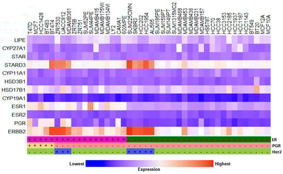 Genomic expression profiles of key steroidogenic factors and hormone receptors in a total of 43 cancerous and non-cancerous breast cell lines. Generation of heatmap illustrates color-based graphical representation of key steroidogenic factors and hormone receptor genes in various breast cell lines (mentioned on top on the heatmap). RNA-Seq datasets for these cell lines were downloaded from Xena browser and analyzed for LIPE, CYP27A1, STAR, STARD3, CYP11A1, HSD3B1, HSD17B1, CYP19A1), ESR1, ESR2, PGR and ERBB2 genes. These cancerous and non-cancerous breast cell lines are ER (+ and −), PGR (+ and −), and Her2+ (+ and −) subtypes, as indicated. Bottom rectangular bar with ‘blue’ and ‘red’ colors at both ends represents lowest and highest expression levels, respectively.