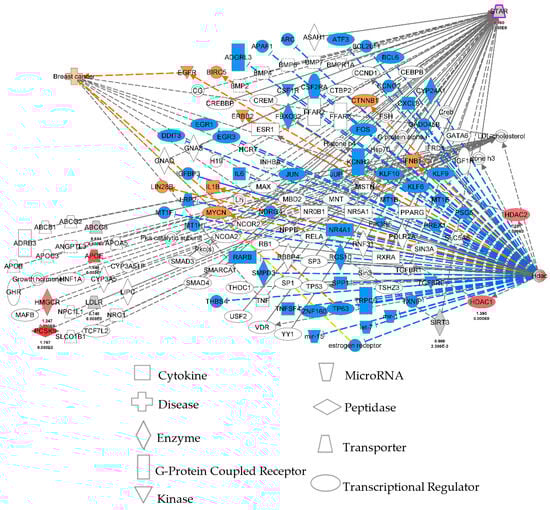 To gain more insights into diverse pathways, networks, and biological functions, ingenuity pathway analysis (IPA) was performed using high-throughput gene expression profiles connecting epigenetic enzymes, cholesterol, and STAR (Figure 6). IPA data revealed that HDACs/SIRTs, cholesterol, and STAR-coupled BC subtypes are coordinately targeted by numerous mRNAs impacting the disease pathogenesis. Noteworthy, HDAC2 and SIRT2 (connected with poor survival of BC patients), APOE (apolipoprotein E), ABCG8 (ATP-binding cassette subfamily G member 8), LDLR (low-density lipoprotein receptor), HMGCR (3-hydroxy-3-methylglutaryl-CoA reductase), and PCSK9 (proprotein convertase subtilisin/kexin type 9), in addition to STAR, were found to be significantly associated with tumorigenesis in the breast tissue (Figure 6). Data are either unavailable or scanty for a number of HDACs. Despite the limitations, IPA predicted/identified a number of downstream effectors and new targets whose relevance to breast pathogenesis will be assessed in our future investigations.