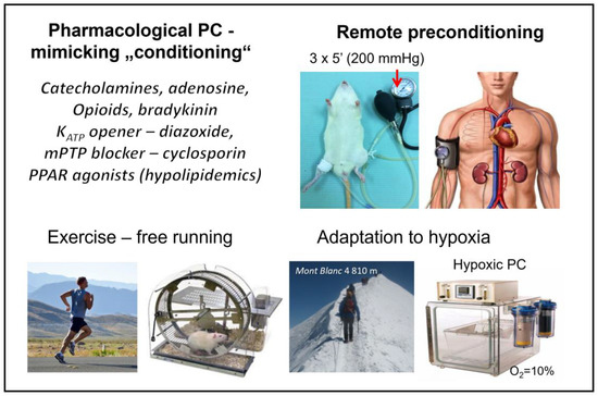 Importantly, a powerful protection against I/R injury can be rendered by several other “conditioning” approaches that do not require invasive interventions or special techniques. Such interventions include adaptation to hypoxia, modulation of temperature, PC of a distant organ (remote PC), exercise-induced PC, or pharmacological PC through applying substances that mimic the processes of PC (Figure 1).